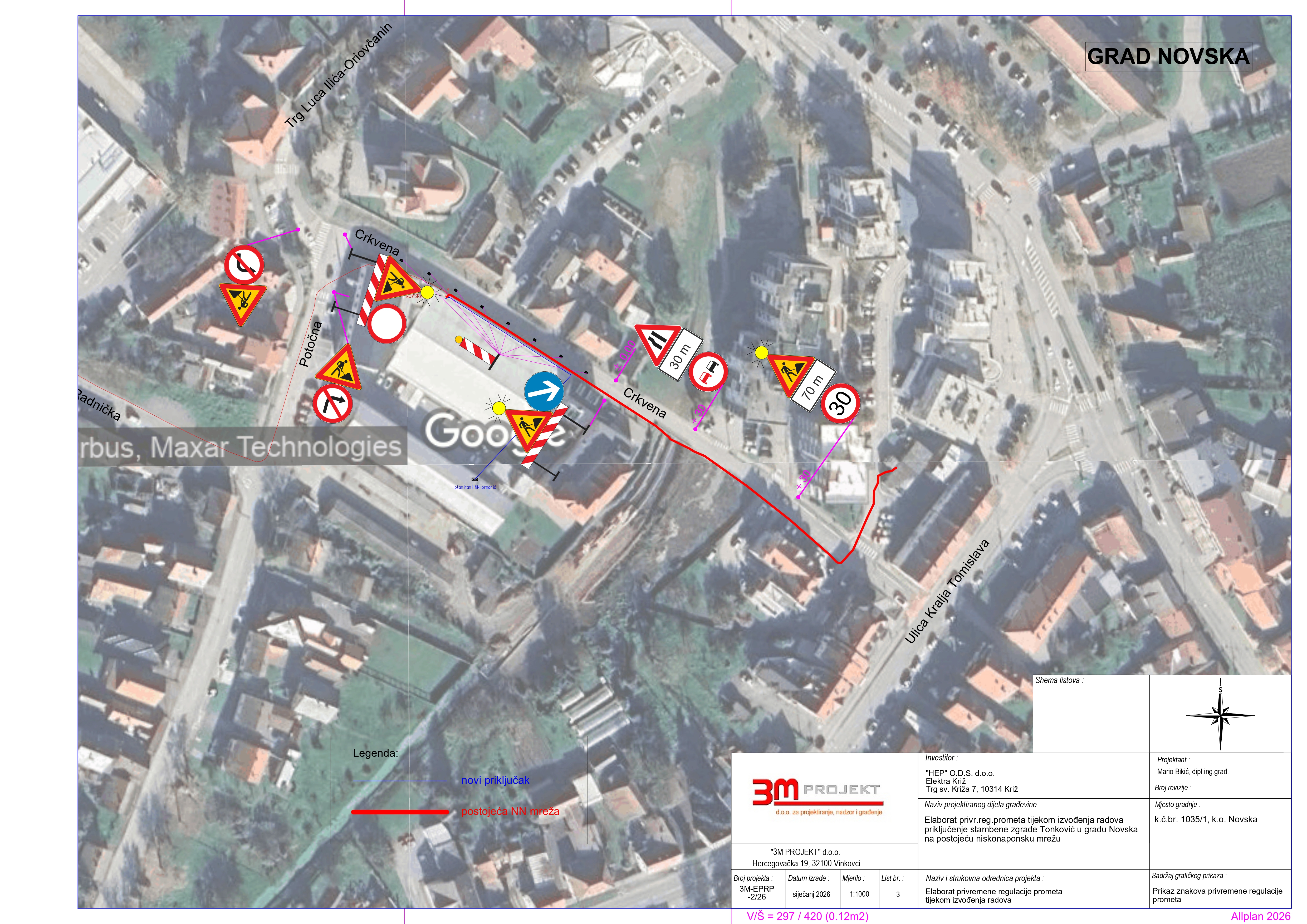 Obavještavaju se građani da dana 23. veljače 2026. godine započinju radovi na izgradnji priključka stambene zgrade na postojeću niskonaponsku mrežu u Crkvenoj ulici u Novskoj. Za vrijeme izvođenja radova bit će uspostavljena privremena regulacija prometa sukladno odobrenom Elaboratu privremene regulacije prometa.